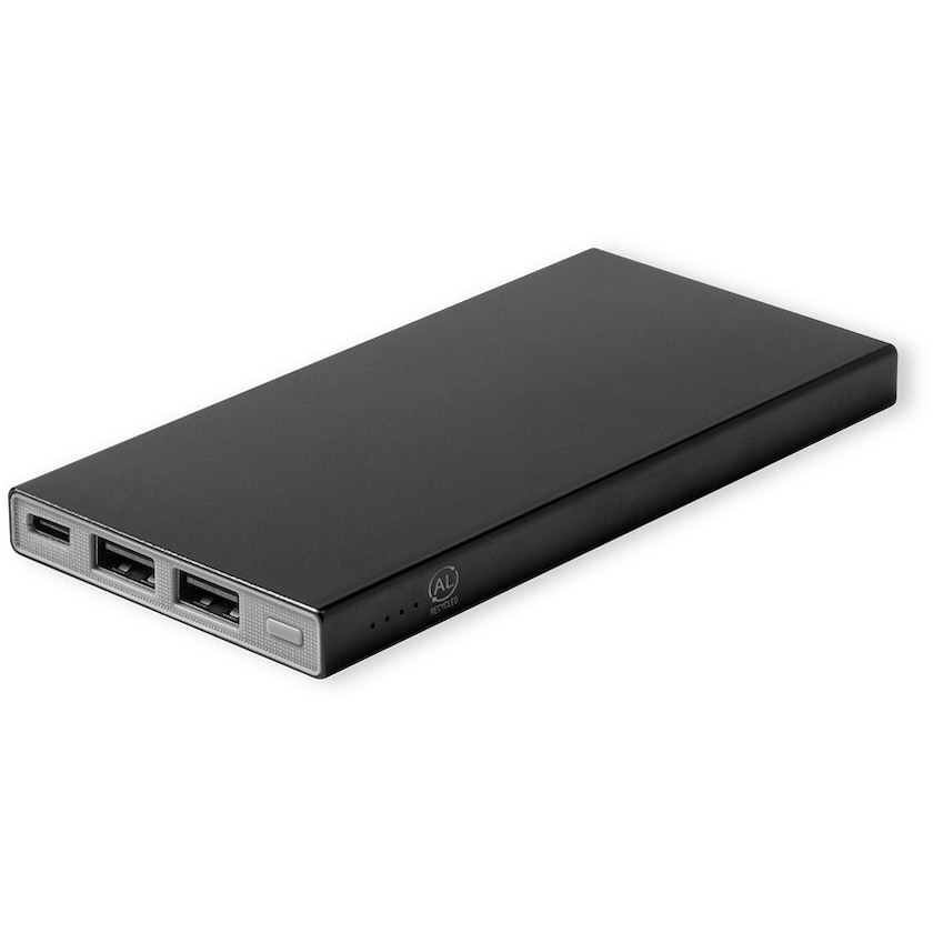 Powerbank av återvunnen aluminium. Powerbanken har fyra dioder som visar återstående energinivå. USB-kabel av typen C medföljer. Märkning sker med lasergravyr.
