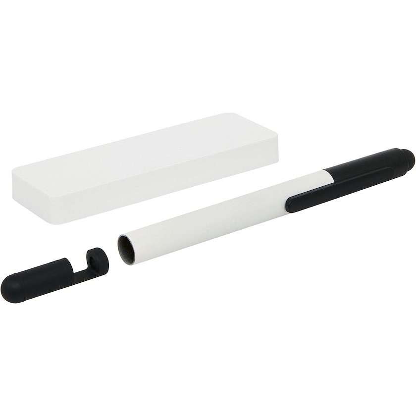 Set med powerbank och touchpenna. Pennan fungerar även som mobilhållare. Powerbanken har output 5V/1A och input 5V/1A. Mikro-USB-kabel medföljer. Tryckpriset avser tryck på antingen powerbanken eller pennan. Levereras i en svart presentlåda.