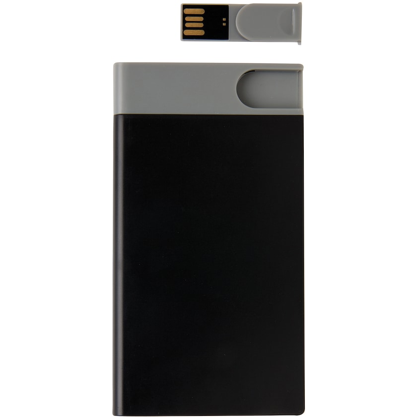 Tunn powerbank med löstagbart USB-minne. USB-minnet har 8 GB-minneskapacitet. Mikro-usb-kabel medföljer. 2.0 Output 1V/1A och input 5V/1A. En funktionell powerbank med stor tryckyta!