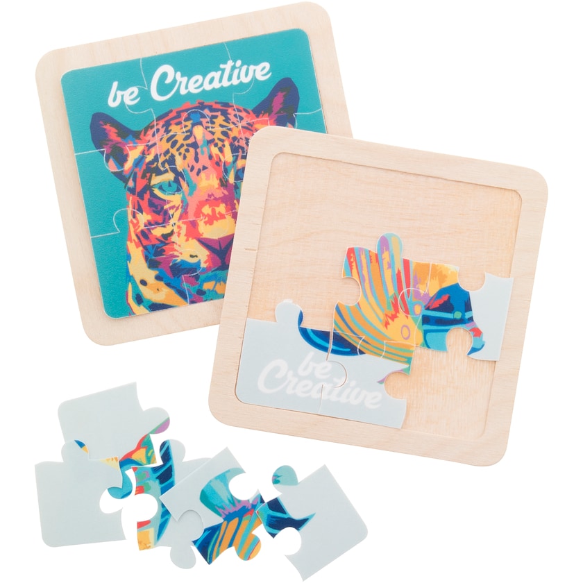 Pussel med digitaltryck. Pusselbitarna är tillverkade av plast medan höljet runt om är tillverkat av laminerad björk. Ladda ner tryckmallen och skapa ett eget pussel från endast 100 st!