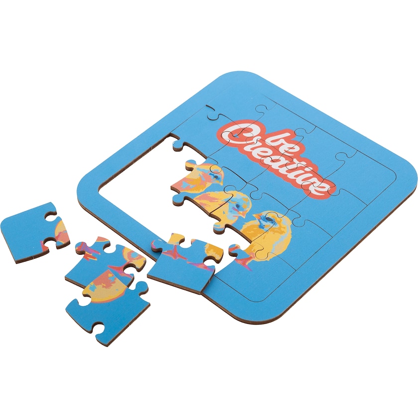 Träpussel med tryck över hela ovansidan. Pusslet är gjort av plywood av björk och består av 16 pusselbitar.