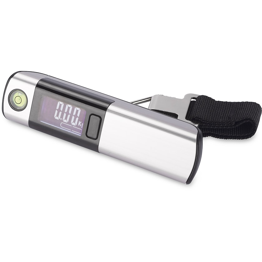 Bagagevåg med LED-skärm. Har ett larm som varnar om vikten överstiger 20 kg. Klarar maximalt 50 kg. Kan visa vikten i kg, oz och lb. Har dessutom ett 1-meters måttband och ett vattenpass. Drivs med ett CR2032-batteri (medföljer ej).