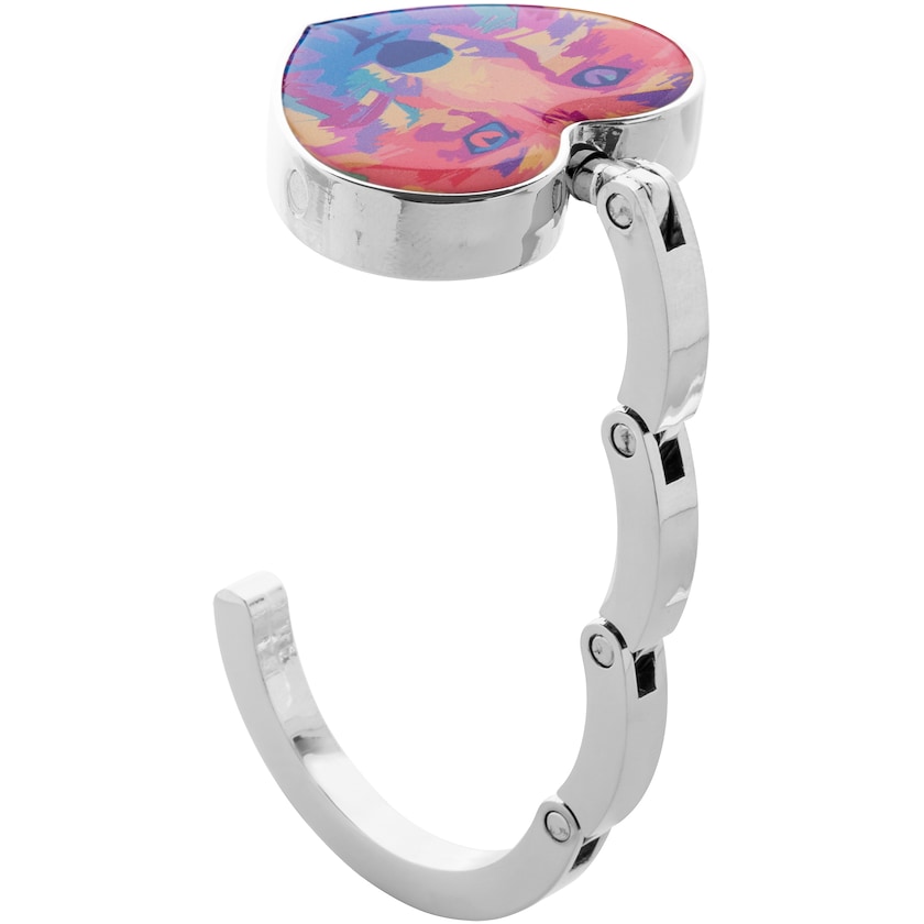 Hjärtformad väskkrok med digitaltryck. Trycket placeras under ett skyddande epoxylager vilket ger ett exklusivt utseende. När väskkroken inte används hålls den samman med hjälp av en magnet. Levereras in en svart presentlåda.