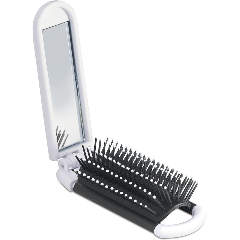 Vikbar hårborste med spegel av plast. När borsten är hopvikt tar den minimalt med plats.