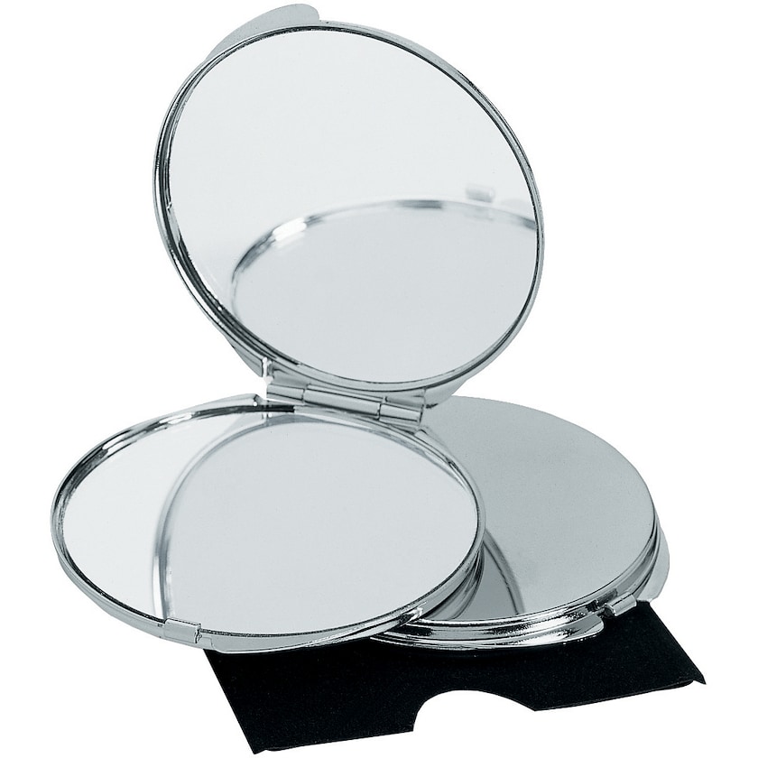 Kromad make-up-spegel av metall. Noah har en vanlig och en förstorande spegel. Spegeln levereras i ett svart sammetsfodral. Märkning sker med lasergravyr.