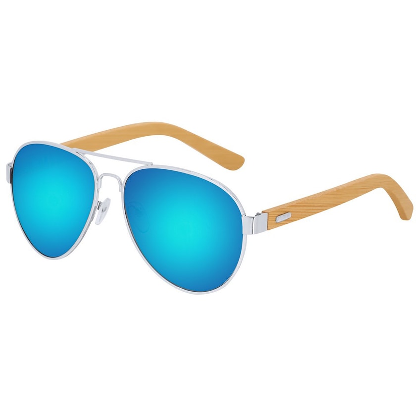 Solglasögon av typen pilotglasögon med spegelglas. Linserna har UV400-skydd. Skalmarna är gjorda av bambu. Levereras i en påse av mikrofiber.