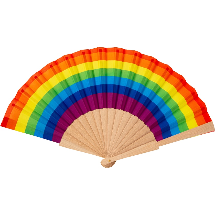 Solfjäder med regnbågsmönstrat tyg. Tillverkad av polyester och trä.