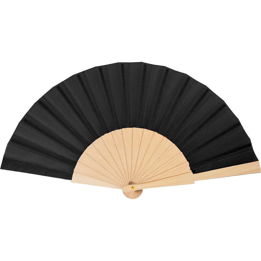 Solfjäder av trä med tyg av miljövänlig rPET. Märkning sker med tryck eller lasergravyr på den yttersta träribban.
