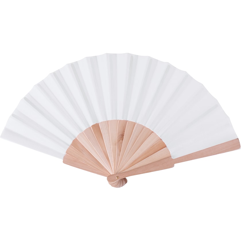 Solfjäder av trä och tåligt tyg av polyester och bomull. Märkning sker med tryck eller lasergravyr på träribban.