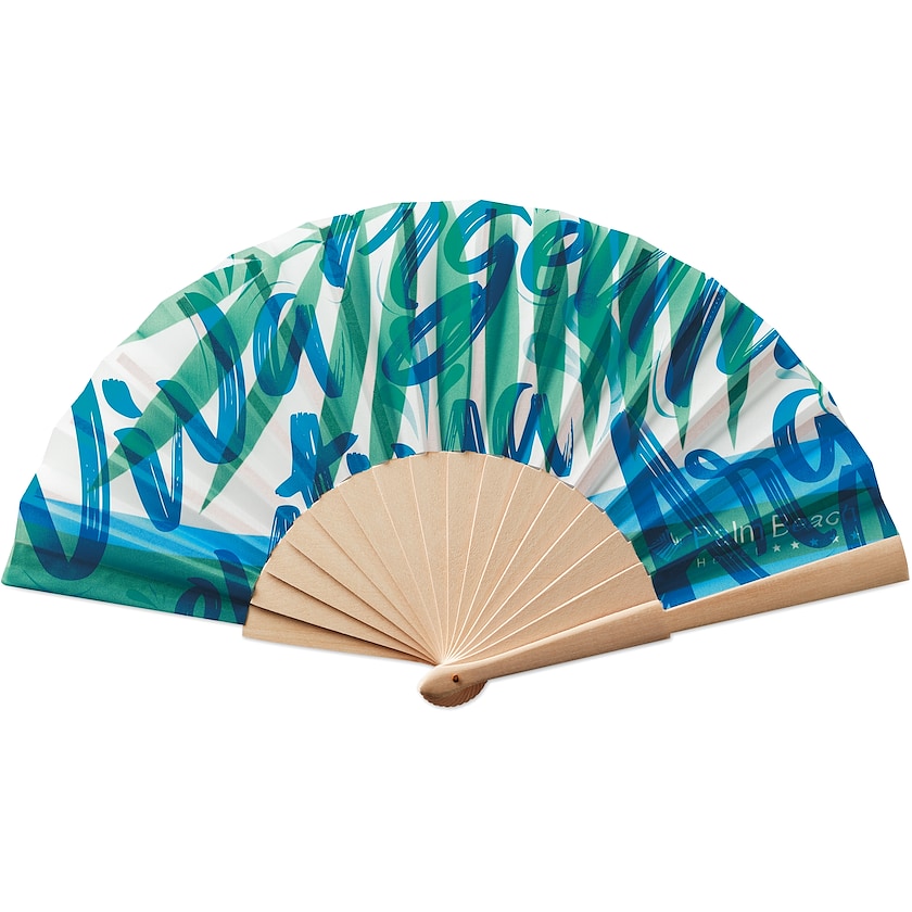 Solfjäder av trä med digitaltryck. Trycket sker på tygets ena sida och baksidan är vit. Solfjädern har 14 ribbor och två slutstycken. Eftersom solfjädern tillverkas efter beställning är leveranstiden längre än normalt.