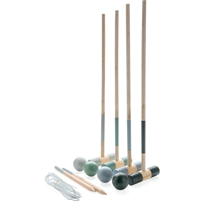 Vackert designat krocketspel. Setet innehåller 4 krocketklubbor, 4 krocketklot, 2 målpinnar och 10 bågar av metall. Förvaringspåse av bomull samt instruktionsbok medföljer. Trycket sker på förvaringspåsen.