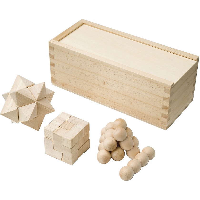 Set med tre utmanande spel som tränar det logiska tänkandet. Spelen och förvaringslådan är tillverkade helt i trä. En miljövänlig och smart företagsgåva!