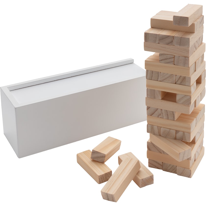 Jengaspel av FSC-certifierat trä. Setet innehåller 48 byggklossar. Levereras i en vit förvaringslåda av trä.