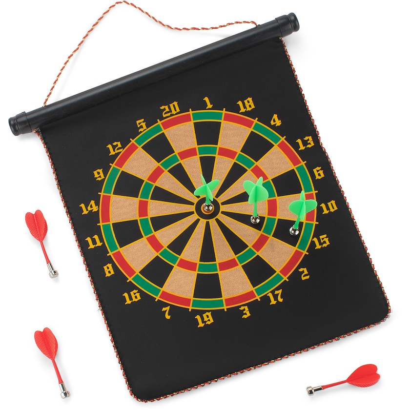 Darttavla med magnetiska pilar. Ett måste för alla dartfans! Darttavlan har två sidor och är försedd med ett snöre så att den lätt kan hängas upp. Sex magnetiska pilar medföljer. Levereras i en snygg papptub.