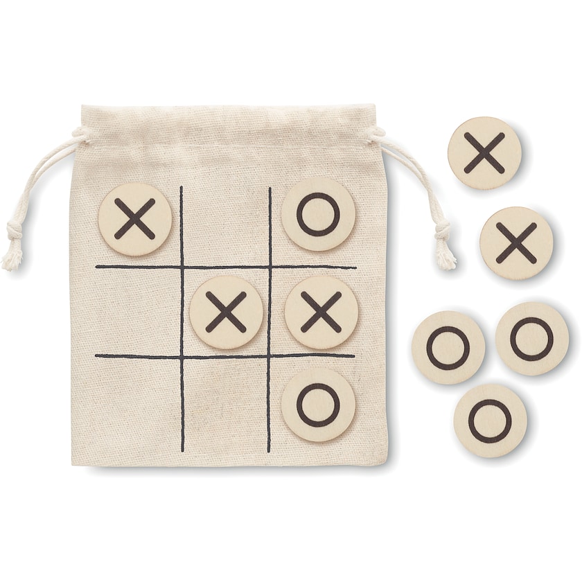 Luffarschack av trä i naturfärgad bomullspåse. Ett kul spel som kan tas med överallt. Trycket sker på bomullspåsen.