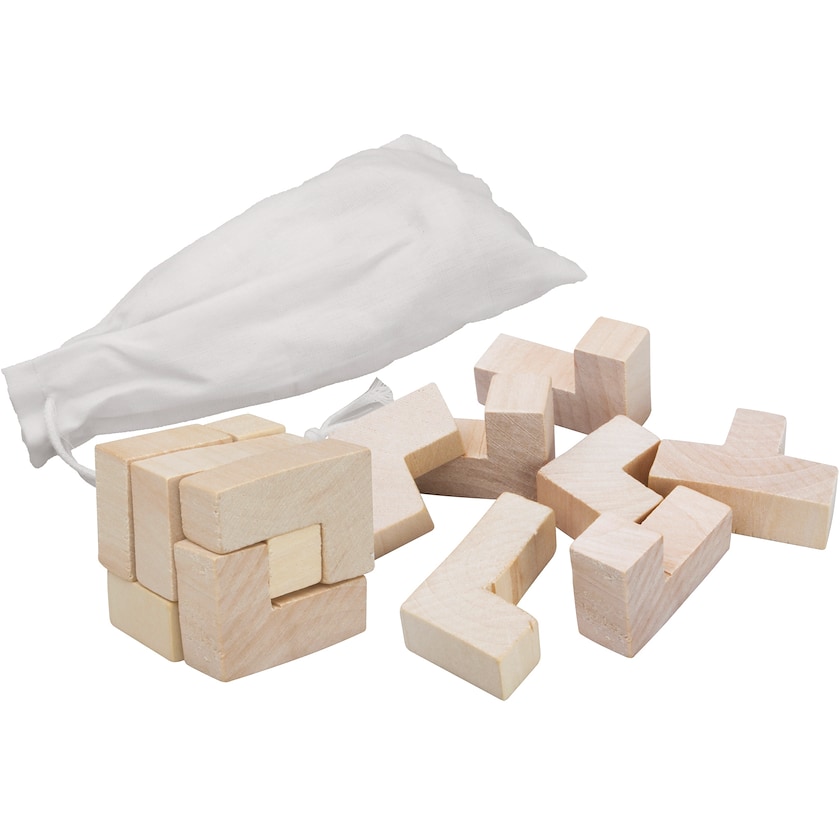 IQ-spel i trä i naturfärgad bomullspåse. Spelet är av trä. Ett mycket prisvärt IQ-spel! Välj mellan tryck eller lasergravyr. Tryck sker på påsen och lasergravyr på en av klossarna.
