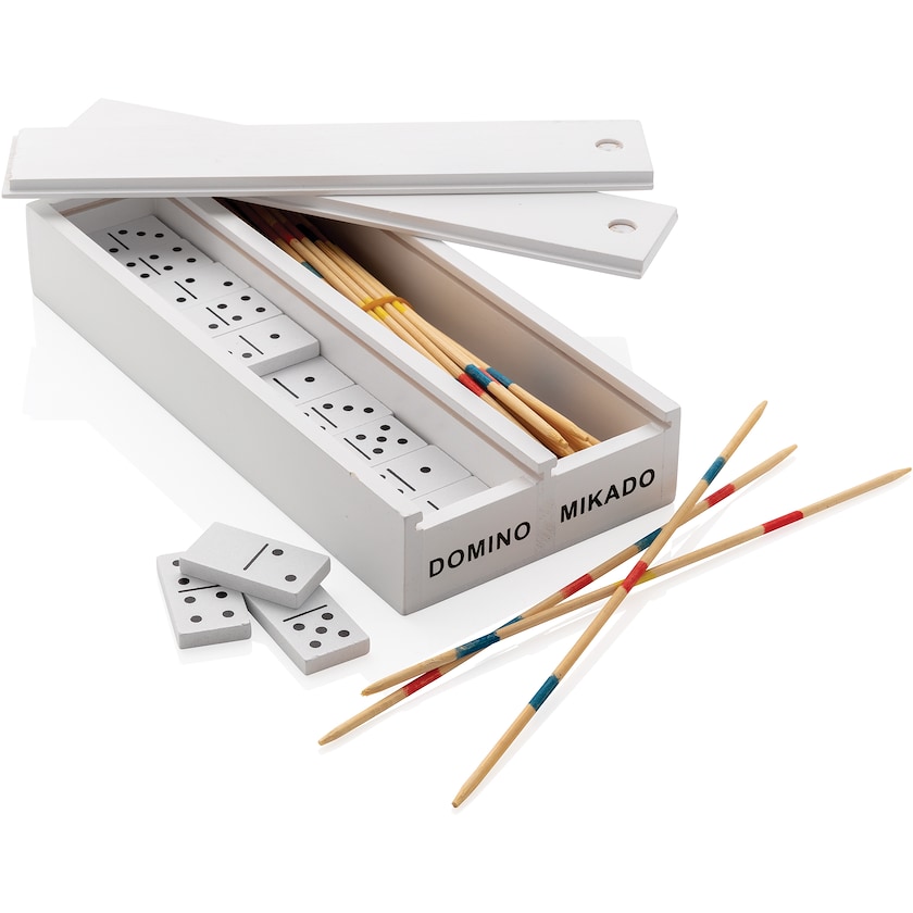 Set med de två klassiska spelen Mikado och Domino. Spelen levereras i en snygg vit låda samt en yttre presentlåda. En perfekt gåva för dig som vill ge bort ett spel som aldrig går ur tiden.