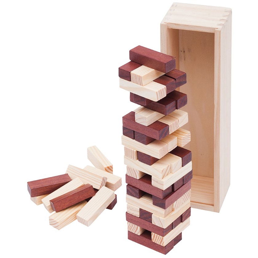 Träspel som kräver stor koncentration och skicklighet. Spelarna turas om att plocka bort träboxar och placera dem högst upp. Ett populärt spel som kräver stor koncentration. Märkning sker med lasergravyr på trälådan.