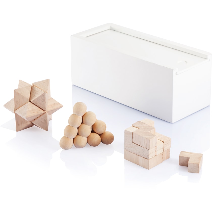 Snyggt set med tre 3D-pussel som tränar hjärnan. Setet och förvaringslådan är tillverkad av trä och trycket sker på lådan. Allt levereras i en snyggt designad presentkartong.