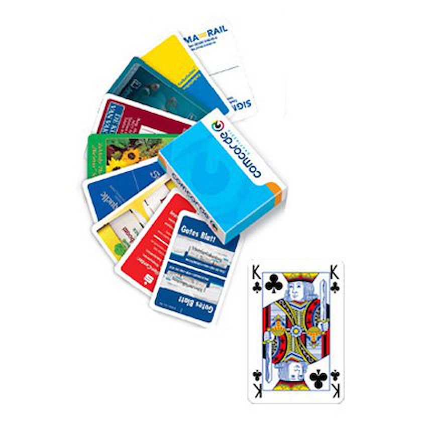 Kortlek med ask. Spelkorten har bridgestorlek och de internationella figurerna. Reklambudskapet trycks på baksidan. Levereras förpackade i pappersask.