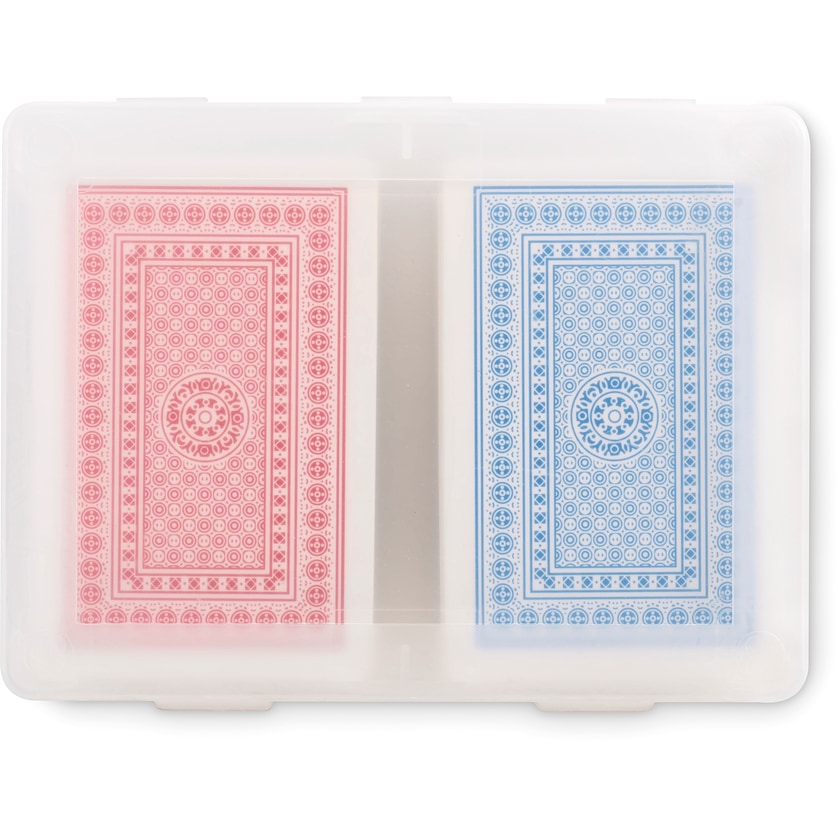 Set med två kortlekar med eget tryck. Kortlekarna har vardera 54 kort och har blå respektive röd baksida. Levereras i en ask av återvunnen polypropen.