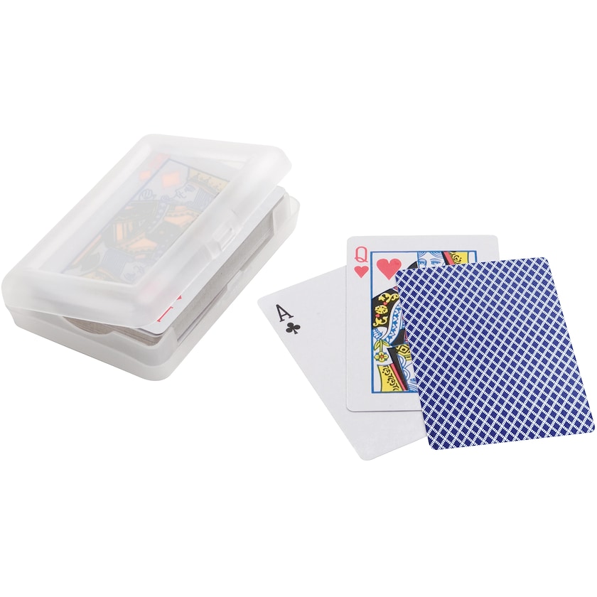Kortlek med 54 spelkort i plastask. Trycket sker på plastaskens ovansida.