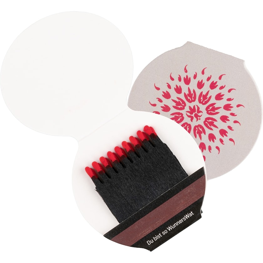 Runt tändsticksplån som rymmer 18 st tändstickor. Ett unikt tändsticksplån för dig som vill sticka ut! Priserna inkluderar tryck på insidan. Tryck i max fyra färger sker enligt Pantoneskalan och däröver i CMYK. Du väljer fritt bland 16 olika knoppfärger och 7 olika träfärger. Beställ runda tändsticksplån med tryck hos Axon Profil!
