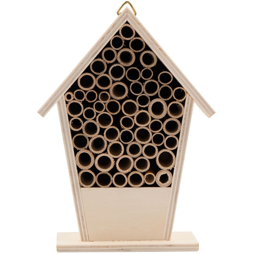 Insektshus för en grönskande trädgård. Insektshuset är gjort av plywood och vass. Märkning sker med lasergravyr.