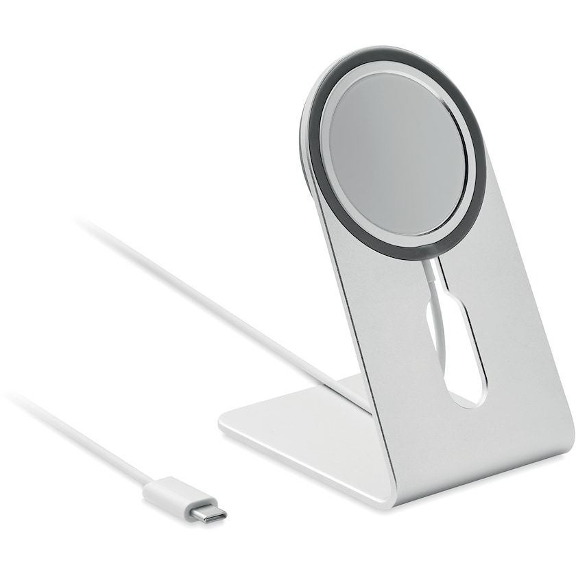 Magnetisk trådlös laddare av aluminium. Kompatibel med de senaste Android-modellerna samt iPhone 12 och nyare. En extra magnetisk ring medföljer för att möjliggöra laddning av icke-magnetiska mobiltelefoner. Märkning kan antingen ske med tryck eller lasergravyr.