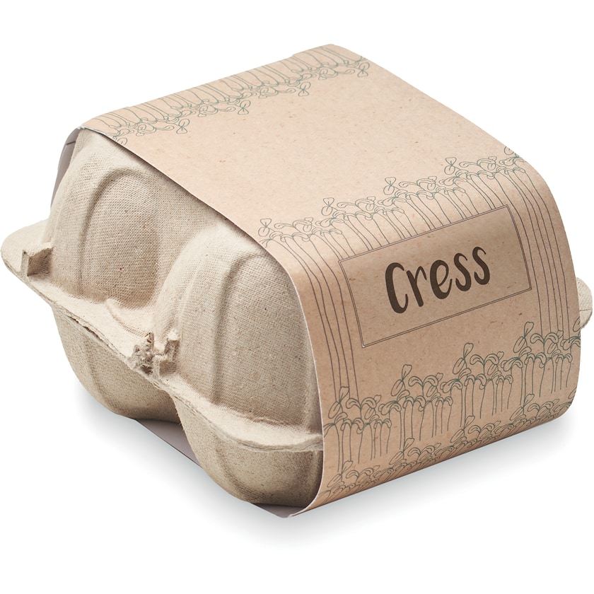 Odlingssats för krasse i trevlig äggkartong. Setet består av fyra lerkrukor fyllda med jord och frön. Trycket sker på pappersbanderollen som omsluter äggkartongen. Producerad i EU.
