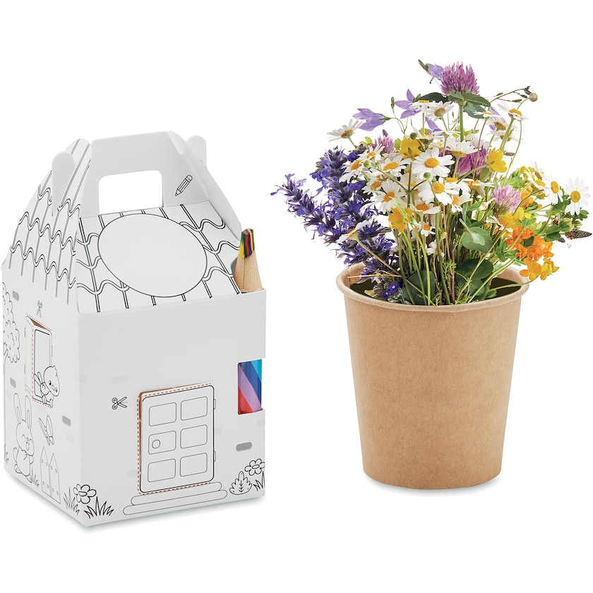 Odlingssats för barn. Inkluderar kruka i naturfärgad papp, frön för honungsblommor samt en flerfärgad färgpenna.