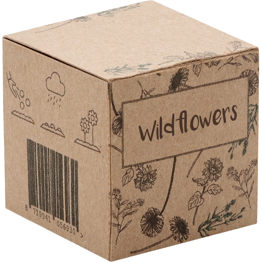 Växtboll med frön för vildblommor. Levereras i en naturfärgad kartong där trycket sker. Tillverkad i EU.