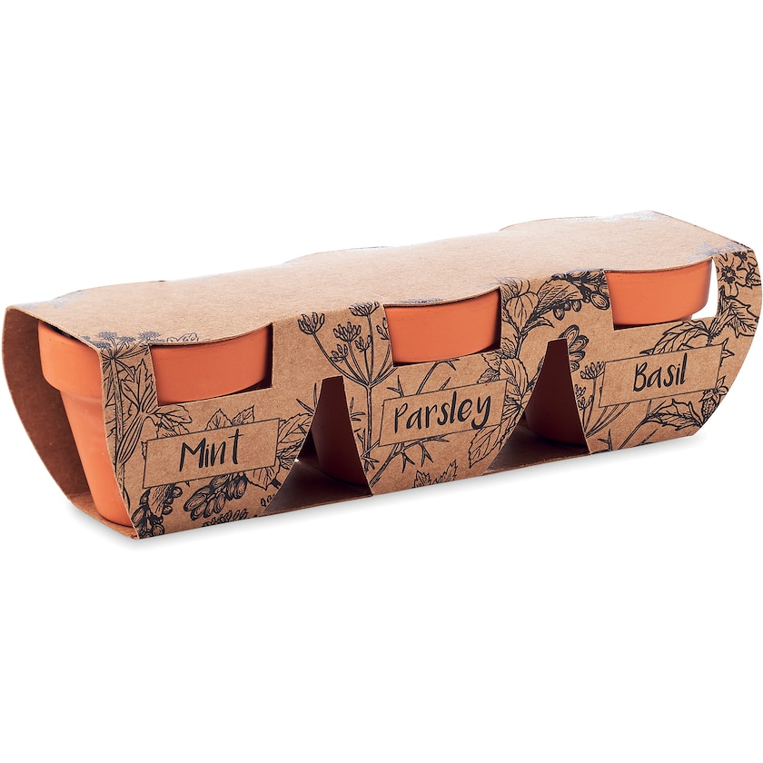 Odla din egen lilla örtträdgård! Set med tre krukor som innehåller frön för odling av mynta, persilja och basilika. Ger härliga smaker åt din matlagning. Tillverkat i EU. Endast 1-färgstryck är möjligt.