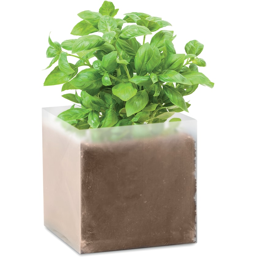Litet set för odling av basilika. Tillsätt bara 30 cl vatten och du har 1 liter odlingsjord där basilika snart gror. Tryck sker med 1-färgstryck.