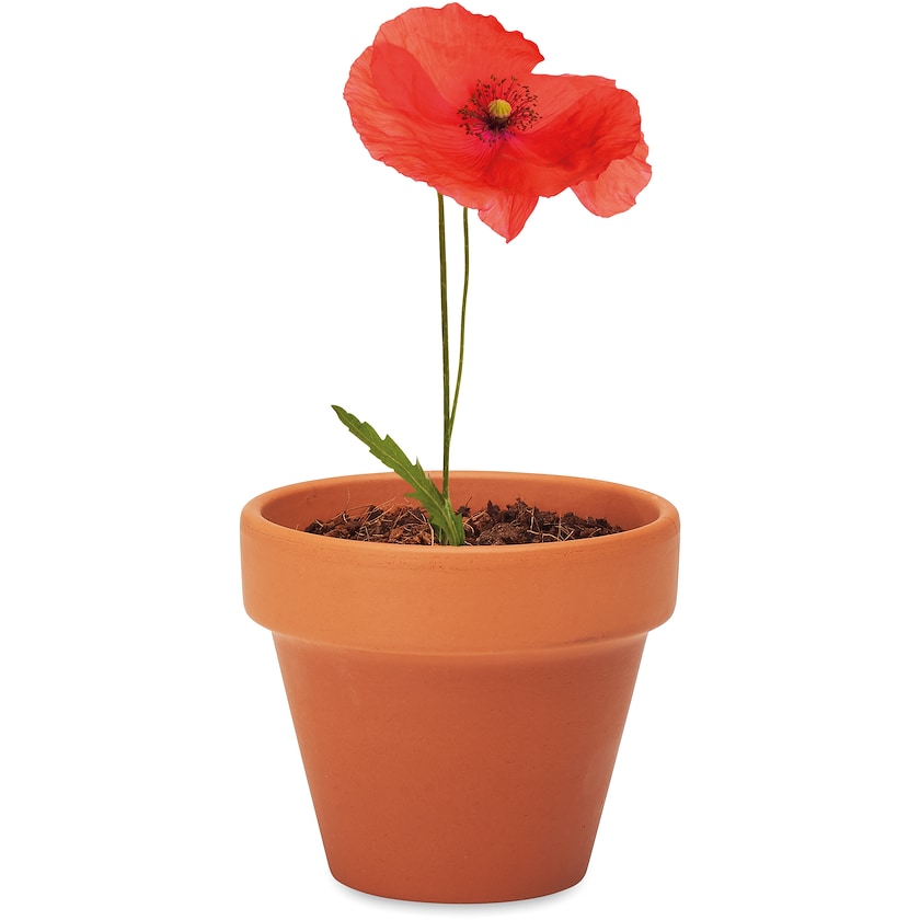 Liten blomkruka med vallmofrö. Märkning kan antingen ske med tryck eller lasergravyr på själva krukan eller med tryck på papphylsans ovansida. Endast 1-färgstryck är möjligt. Tillverkad i EU. Ett perfekt val för dig som söker en liten blomkruka med eget tryck.