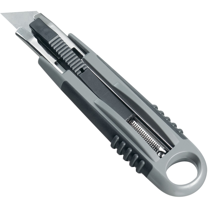 Högkvalitativ tapetkniv med mjuka gummidetaljer. Automatisk återgång i bladet.