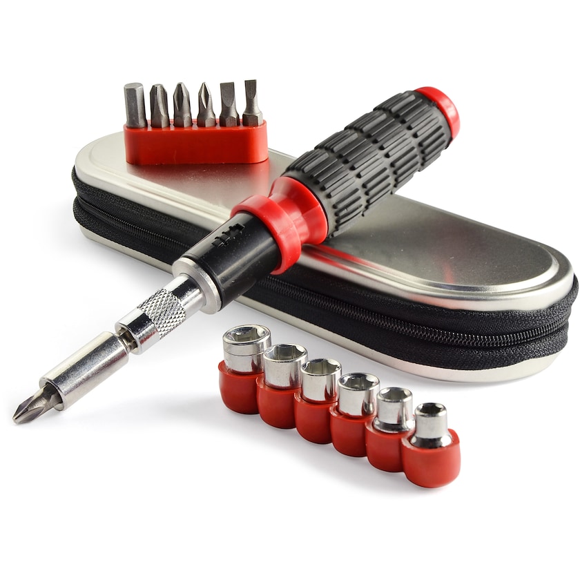 Professionellt verktygsset med skruvmejsel och bitsar. Setet levereras i en praktisk metallask med dragkedja. Märkning sker på asken.
