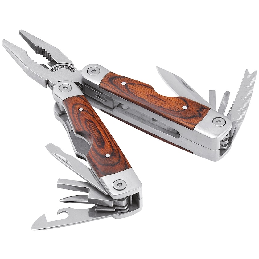 Multiverktyg med handtag med inlägg av pakkaträ. Magnum har hela 22 funktioner och levereras med fodral och bits.