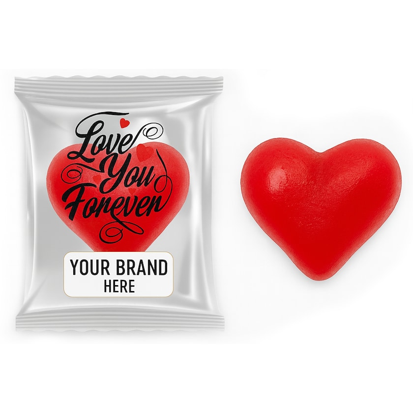Stort geléhjärta i förpackning med ditt tryck. Välj mellan solidvit eller transparent förpackning. En uppskattad gåva till någon du tycker om.