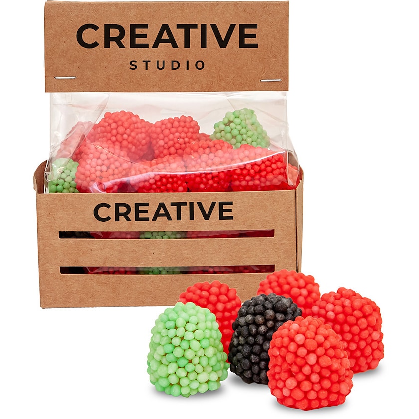 Fruktgelégodis formade som hallon. Levereras i en förpackning av naturfärgat papper. Ladda ner tryckmallen och designa förpackningen helt själv. Behöver du hjälp så hjälper vi gärna till.