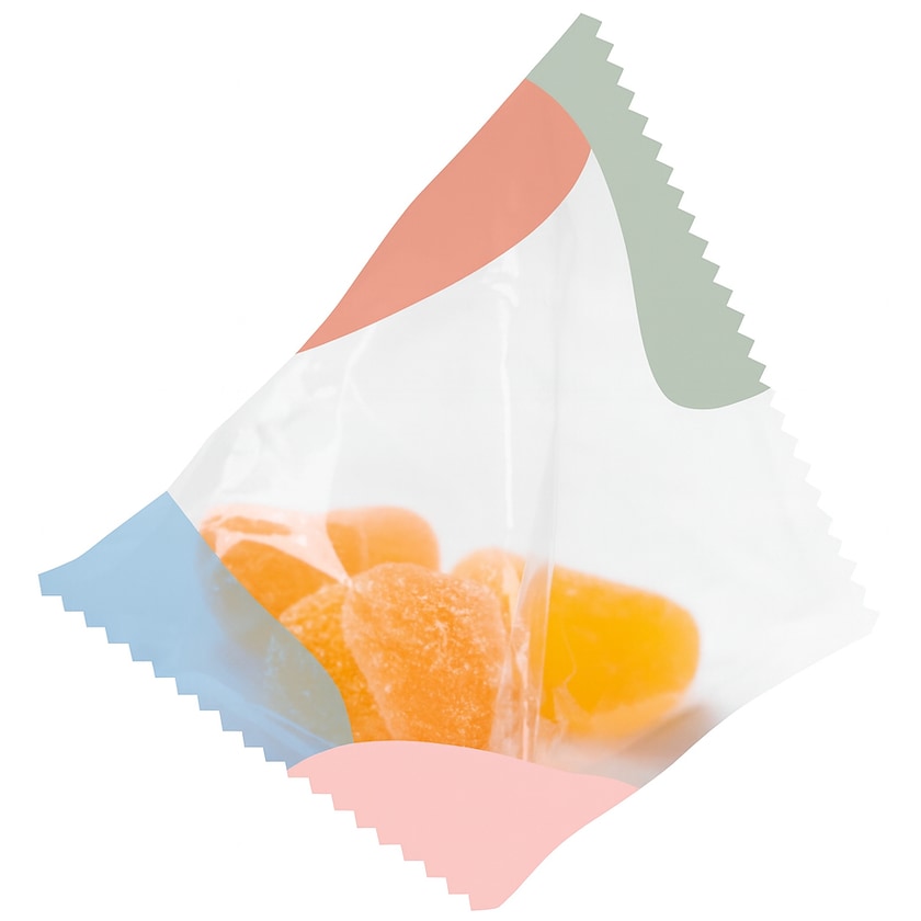 Pyramid med gelégodis. Pyramiden innehåller en härlig mix i smakerna apelsin och citron. Hela kuben trycks efter dina önskemål. Du väljer själv om du vill att pyramiden tillverkas i transparent eller solidfärgat material.