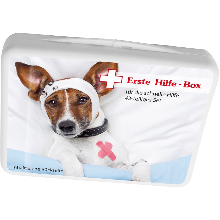Första hjälpen låda med digitaltryckt etikett. Innehåller 43 st första hjälpen produkter: 1 x kompress 76 x 50 mm, 1 x självhäftande tejp 1,25 cm x 3,3 m, 1 x plåster 100 x 50 mm, 10 x plåster 72 x 19 mm, 10 x plåster 57 x 19 mm, 10 x plåster 40 x 10 mm samt 10 x runda plåster 22 x 22 mm. På baksidan finns etikett med innehållsförteckning.