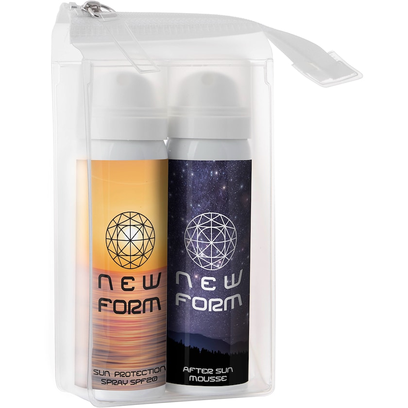 Set med solspray och sunlotion. Respektive aluminiumflaska innehåller 50 ml. Solsprayen har solskyddsfaktor SPF30. Flaskorna är miljövänliga eftersom de drivs med luft istället för drivgas. Tryckpriset avser tryck på båda flaskorna.