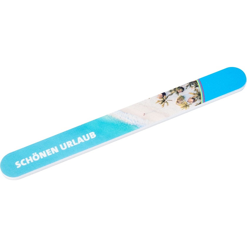 Högkvalitativ nagelfil av salongskvalitet. Nagelfilen är vit från början och trycket sker över hela den ena sidan. Kärnan består av plast och ytan av grus. Ett praktiskt förvaringsfodral av plast kan köpas som tillbehör.