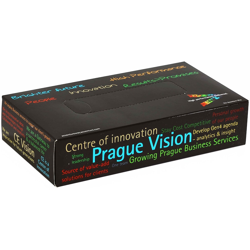 Pappbox med 100 st näsdukar. Näsdukarna är uppbyggda av två lager och är tillverkade helt av cellulosa. Hela pappboxen trycks efter dina önskemål.