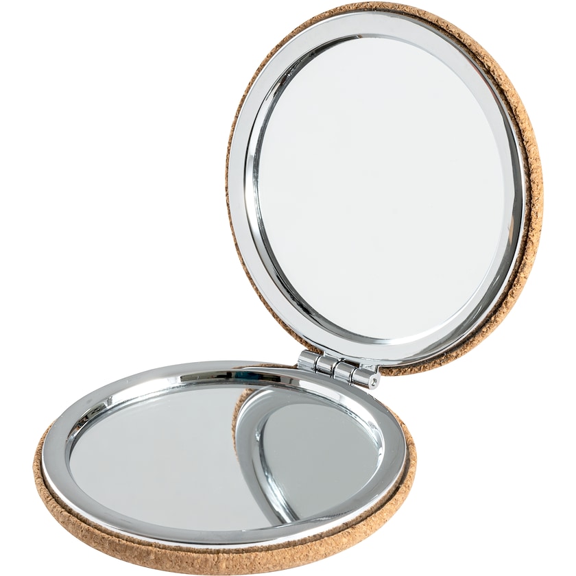 Rund sminkspegel med utsida av kork. Melinda har dubbla spegelglas och levereras i ett pappersfodral av naturfärgad papper. Märkning sker med lasergravyr.