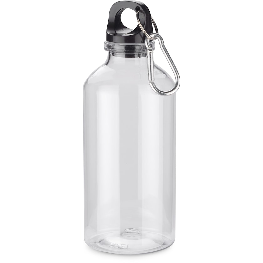 Transparent vattenflaska av återvunnen plast. Alameda har låg vikt och är försedd med en karbinhake så att den t ex kan fästas på en ryggsäck.