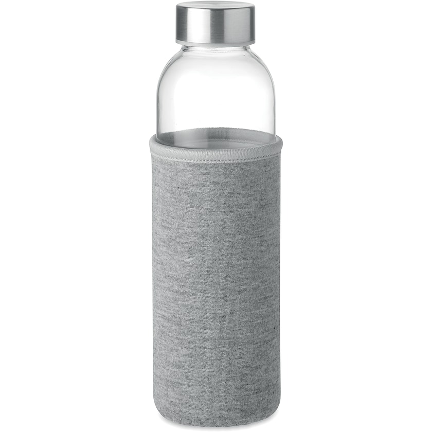 Sportflaska av glas med neoprenpåse. Flaskan rymmer 50 cl och är försedd med ett elegant lock av metall. Trycket sker på neoprenpåsen. En sportflaska av glas ett perfekt val för dig som söker en lite mer exklusiv sportflaska!