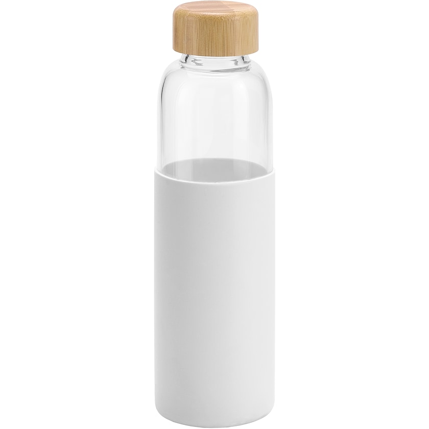 Vattenflaska av glas med grepp av silikon. Locket är tillverkat av bambu. Glaset är eldfast och mycket tåligt. Levereras individuellt förpackad i en pappkartong. Endast 1-färgstryck.