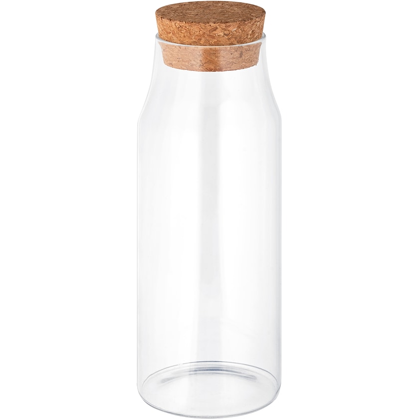 Stor glasflaska av tålig borosilikat med korklock. Levereras i en presentförpackning av kraftpapper.